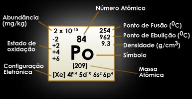 Derivado de Polônia, a pátria de Marie Curie, sua descobridora em 1898 na França. Marie Curie juntamente com seu marido Pierre Curie descobriram o Polônio no mineral de urânio Pechblenda, na fração precipitada com o gás sulfídrico e contendo o polonio. O acompanhamento de seu trabalho de separação do Polônio foi conduzido pela análise da atividade radioativa das frações pelo auxílio do eletrômetro. Obtido atualmente pelo bombardeio do Bi-209 com nêutrons. É um metal facilmente atacado pelos ácidos e com HCl forma o PoCl4. Funde a 254oC e existe em duas formas alotrópicas. Extremamente perigoso e acima de 6,8 x 10-12 g já é tóxico.